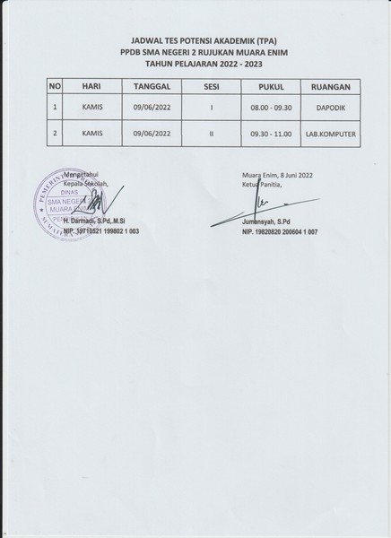 Jadwal Tes Potensi Akademik (TPA) PPDB SMAN 2 Rujukan Muara Enim