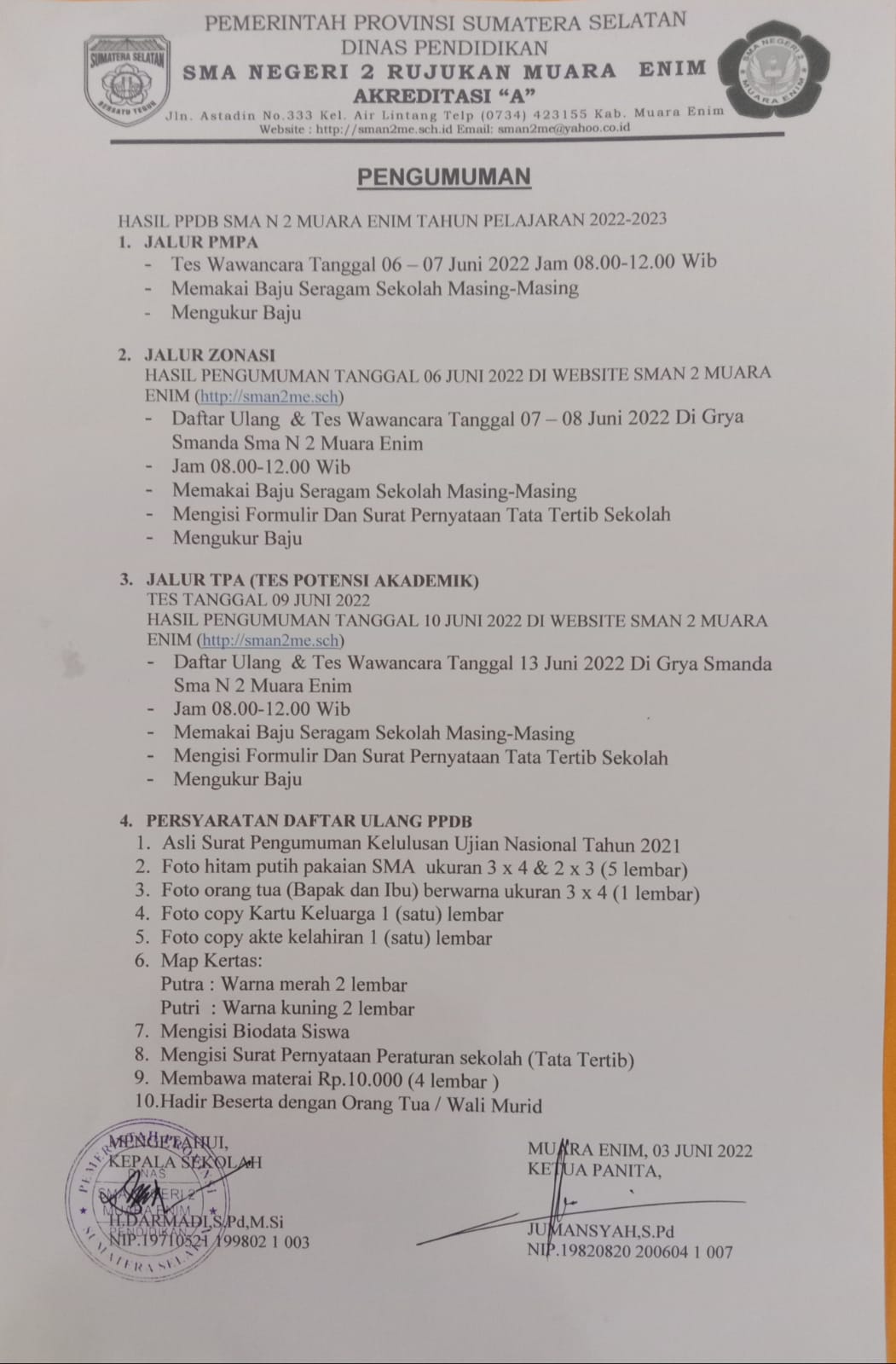 Pengumuman Hasil PPDB dan Persyaratan Daftar Ulang SMAN 2 Muara Enim Tahun Pelajaran 2024/2025